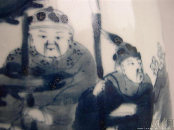 青花发色灰蓝,绘有人物8个,底有火石红和窑沾,本站专家定为清早期.