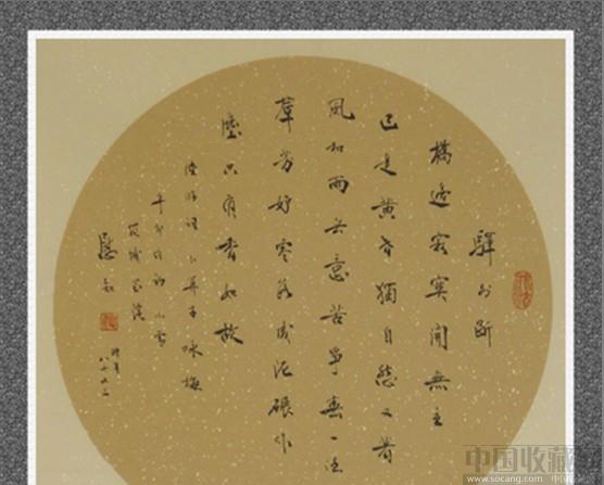 该作品基本完整无瑕疵为书房扇面,中酱黄洒金(生宣)1.5平尺。作品规格34cm*34cm未装裱纸本软片,照片由于光线原因对比度反差明显略偏色,电脑合成自添背景。