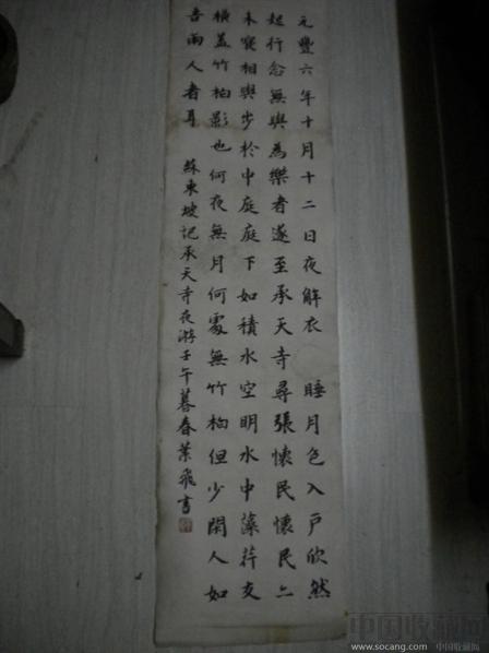 本人收藏出售:叶飞书苏东坡记承天寺夜游现货包快*描述如下:叶飞书苏东坡记承天寺夜游现货包快;尺寸规格:135cm(长)x34cm(宽)*包邮*品相:7品*注:背有复纸,有小修。只有一份。为收藏、欣赏,是不错的选择!能陶冶情操、心灵、增知!!望有对此类收藏感兴趣的朋友,可及时与我联系!别错良机!款到,货品马上送到家!!!购买顺序及温馨提示:1\:该品拍摄,卖家已力保实物一致。每人对新旧程度和成色多少的评判标准不同,所以请买家自行参考图片。有不清、不明,可请懂行或专家把关。也欢迎向卖方周先生发qq-771728249\旺旺\电话:(021)62338483/15000058890或等咨问{非诚勿扰},谢谢!2\:您对物品意愿相吻,可直接网上拍下。3\:运费:同城、异地“一口价”成交,均包平邮挂号(国外另议)。4\:卖家把“信用”放在第一位!以最终双赢:‘好评’为结点!要是对卖家各方都满意,望能在卖家描述、服务、速度打5分,将不胜感激!!不接受‘中’或‘差’评。有不清、不满,可通过事‘评’前说明和解释。只要在正常合理范围,完全可以完善和弥补(做不到,望不要操作)。5\:怨不上门看货!(哪位大户,愿整体或一类目收购卖家商铺上架的货品,欢迎洽谈)!