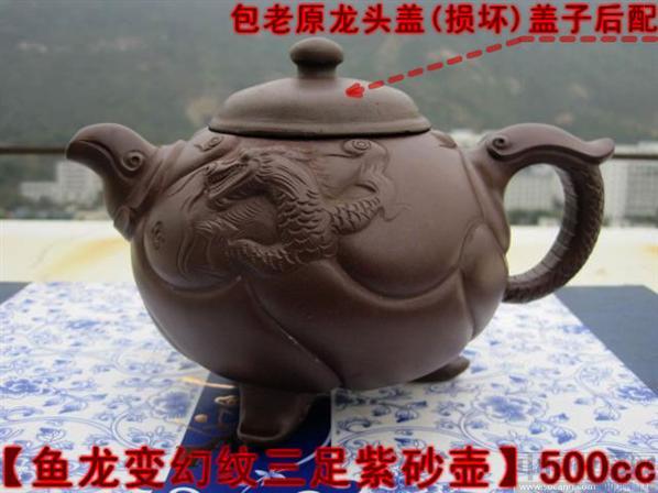 此种壶型应该为民国高圆型鱼化龙壶精典壶型,三足更为少见,鱼化龙,古已有的故事。《琵琶记》中就有言:“孩儿出去在今日中,爹爹妈妈来相送,但愿得鱼化龙,青云直上”。鱼化龙壶纹样一般都以鱼、龙组成,寓意飞黄腾达、平步青云。由于鱼化龙美好的形象结构及其优良的实用功能,因此流传至今,历久不衰。此壶选泥精细,泥色极为纯正,(双手摸在壶上,手感极其细腻舒适,难得的极品好料啊),线条流利,简洁明快。鱼龙吐珠,神韵生动,优美灵活,配以龙尾执柄壶把,浑成一体,格律谨严,壶名:鱼龙变幻纹三足紫砂壶,壶内以泡成有厚厚的茶渍,壶身表面以养成光亮夺目。尺寸:高12cm,容量:500cc以上(原龙头盖损坏)盖子后配(后配盖子有裂)实物拍摄,图物一致,品相如图。
