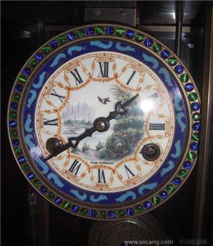 ;1808年产自法兰西(珐琅彩座钟)座钟高为55CM,全功全彩,十分精美,四条中柱为元铜顶珐琅彩条包浆,钟盘为瓷片带彩画,为12古罗马字母,清晰可见。钟盘彩边,为60颗蓝、绿宝石。钟舵中央为蓝宝石.周边有精细铜纹,清晰全盘。走时非常准,青翠报时。背后两块生产贴牌为(madeinfrance31day1808)。为收藏钟的精品。纸币价格浮动变化快,拍卖前请先咨询QQ:151440193