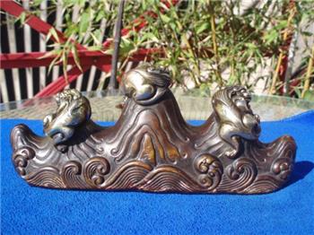 相关藏品: 黄铜整浇铸笔架,底部刻着大明宣德年制,山形海水纹刻有状元二字