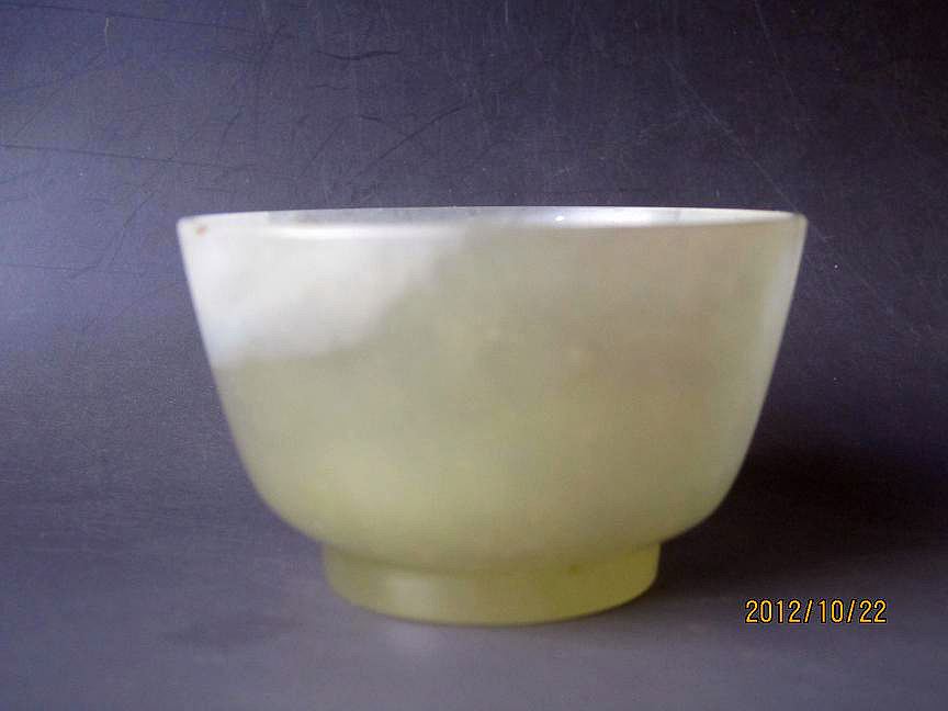 该西汉皇室贵族饮用长生不老丹药杯囗径6.1厘米. 玉杯在周穆王时代就创世, 当时西胡人以和田白玉精制而成. 用途有二: 一是用作承接神露(露水)兑玉粉铅砂硃砂等制长生不老丹药; 二是用作饮酒, 酙满美酒, 对着月亮, 光明夜照,杯內 渾若月晕, 圆若月相, 故称"夜光杯". 唐王翰曾举玉杯写下千古绝句:"葡萄美酒夜光杯,欲饮琵琶马上催; 醉卧沙场君莫笑,古来征战几人回." 此玉杯为和阗羊脂白玉雕琢而成, 整器琢磨柔滑,造型奇巧新颖,刀法简练, 玉质莹润, 洁白纯净,近两千年的土中浸润变成秋葵色, 口沿已有局部鸡骨白浸沁, 色泽自然淡雅,技艺匠心独运; 壁薄如纸,碾磨精美, 抛光极佳, 内外光素无纹, 给人一种半透明感, 惹人爱不释手, 惹君小酌几囗! 但此杯应为东汉皇室贵族饮用长生不老丹药玉杯! 因汉代迷信和道术盛行, 帝王将相追求长生不老, 相信方士哄骗的鬼话:用露水兑玉粉铅砂硃砂等制成丹药有助于延年益寿! 而承接露水的器皿必用具"五德"的玉杯! 故秦至汉玉杯一般均为帝王将相饮用丹药之杯.保真转让, 假一赔十,买家如有疑虑,最好请专家鉴定.