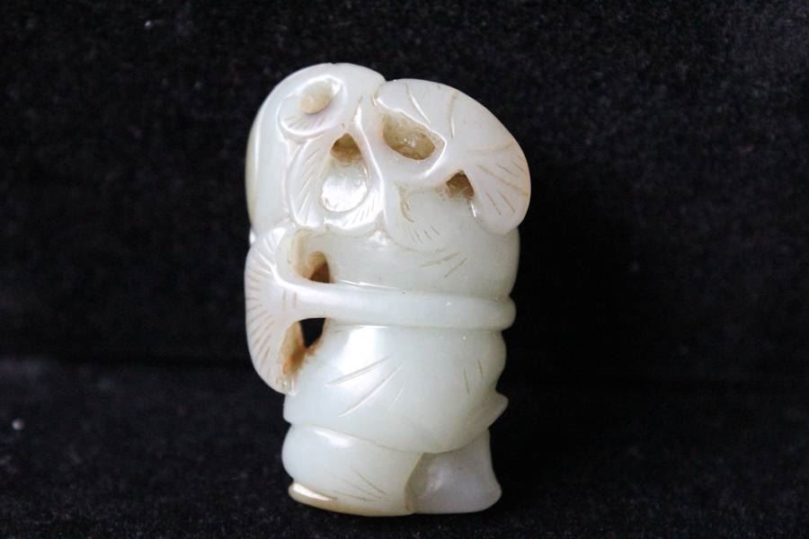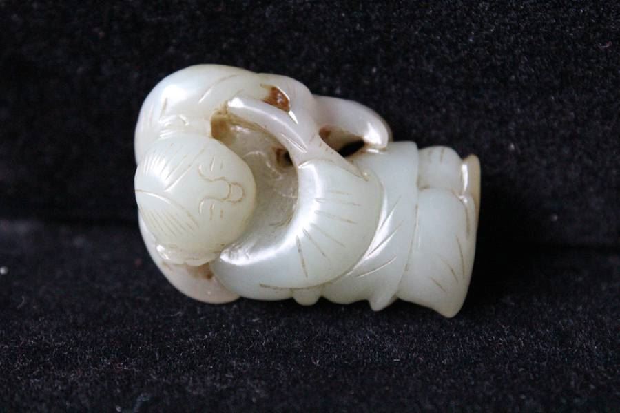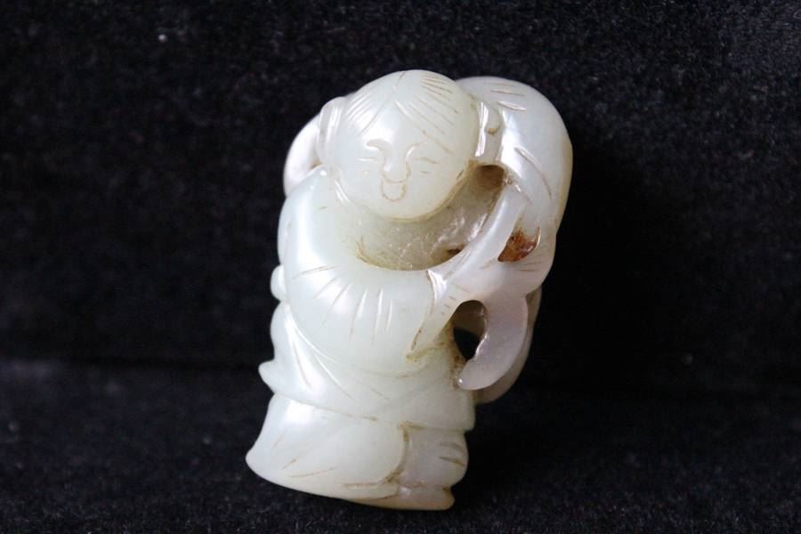 青玉“持瑞童子”挂件 尺寸:3.8*2.8*1.5厘米 和田青玉,玉质细腻致密,光泽温润,油分十足,雕琢童子持瑞形象,憨态可掬,稚气喜人,不错的小挂件。