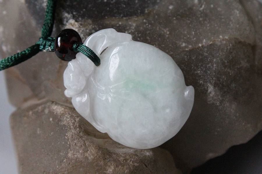 飘阳绿翡翠“福寿”挂件 【尺  寸】 3.2*2.0*0.5厘米 【颜  色】 飘阳绿色 【透 明 度】 亚透明 【工艺水平】 精细雕刻蝙蝠、寿桃;钻石粉抛光,天然飘阳绿翡翠,色典型,水头好,天然特征明显,寓意美好,适合佩戴。
