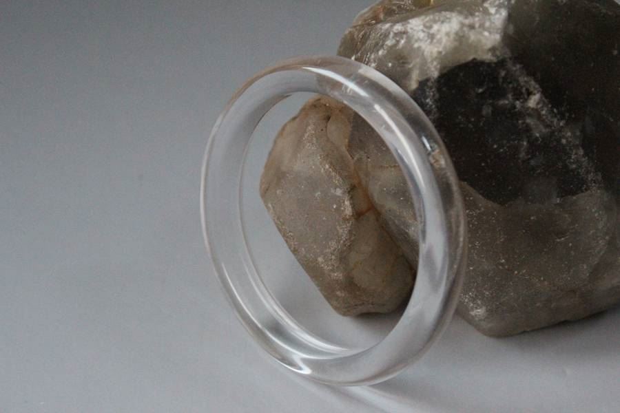白水晶镯子2 圈口:5.9厘米 条宽:1.0厘米 天然白水晶,质细纯净,几乎不含包裹体,全透明,亚金刚光泽,凉感强,晶莹剔透,腕间美品,佩戴送人皆宜。