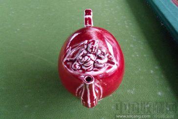 ;;这是现代景德镇民间艺人生产的钧红寿桃壶,非常漂亮、喜庆。集观赏与实用于一身。底部小口可以装水或酒。壶高14厘米宽17厘米