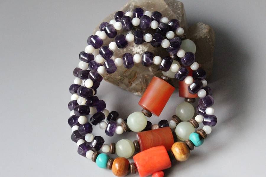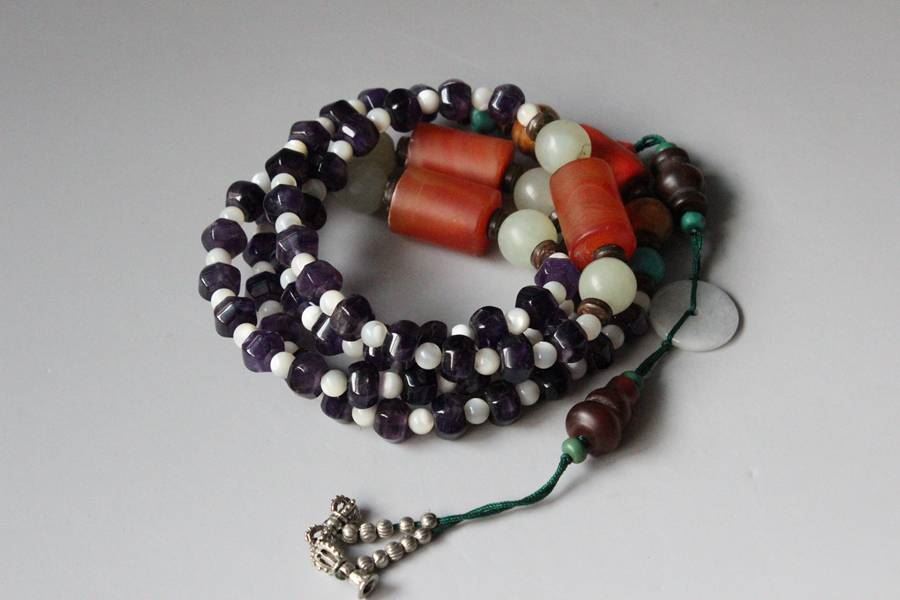 54粒天然瓜棱紫水晶佛珠 珠粒径:1*0.6厘米 54粒天然紫水晶瓜棱珠,配螺钿小隔珠,红珊瑚佛头,缠丝玛瑙隔珠,玛瑙翡翠坠子。