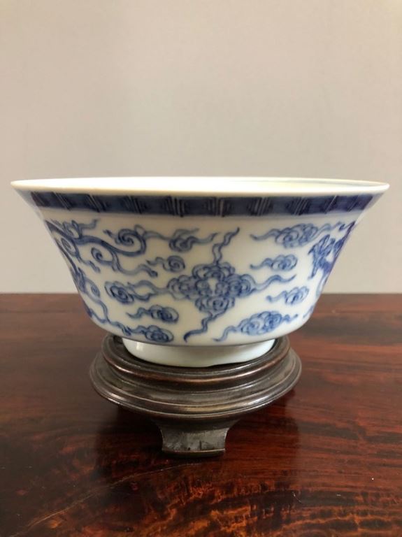所谓官仿官是后代官窑仿前朝的一个名称的总称。在中国陶瓷史上历来就有后代仿前朝的记载,明清时期以本朝仿前朝官窑或御窑瓷的现象较为普遍。此碗为青花绘画龙纹,碗外壁绘有两条行龙穿梭云霄,外口沿一周绘画“回文”,碗内底部绘有一条立龙,龙身四周布满火焰。三条龙均为五爪,显示出其皇家特有的权利。底足书写“正德年制”四字楷书款,圈以双圈,书写工整,笔画有力。直径16厘米。