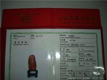 桔皮红田黄石雕,长63毫米,宽30毫米,厚20毫米,重62克,萝卜纹、红筋明显。桔皮红田黄石资源稀少,更显珍贵。有国家宝玉石检测中心出具的“田黄”鉴定证书。