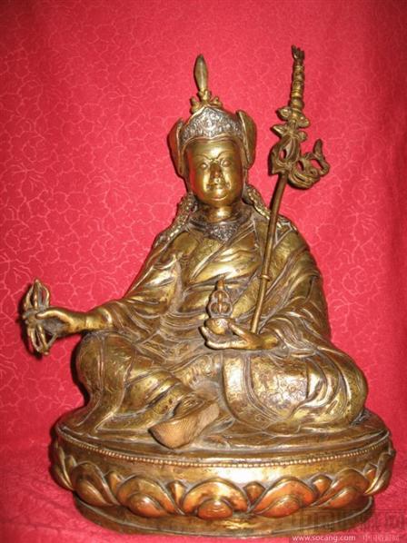 该像造型规整,胎体厚重,纹饰精美,鎏金厚实,造形奇特,封底完好。头顶刻花战盔,可揭开放圣物,目前全国只发现一尊,经国家博物馆研究员王中信专家鉴定为明代中期佛像。特征:莲花生头戴三叉戟头盔,头盔前沿嵌日月形银花饰;双耳吊印式大花坠;内穿衬衣,外穿刻花法衣,披刻花战袍。左手拿嘎巴拉碗,置于左腿上,左肘挟一根人头骷髅降魔杖,右手持金刚杵,置于右腿上;胸前戴有嵌银项圈,脚穿战靴,表情威严沉静。莲花生佛坐大莲瓣仰莲座上,每个莲瓣上刻有卷草纹,单莲瓣硕大,中间夹小莲瓣。仰莲瓣上有半圈小珠纹饰。莲花座背后有六字梵文或八思巴文。莲花生降妖除魔,谁拥有谁家得安康,得富贵。佛像高34厘米,宽23厘米,厚18厘米