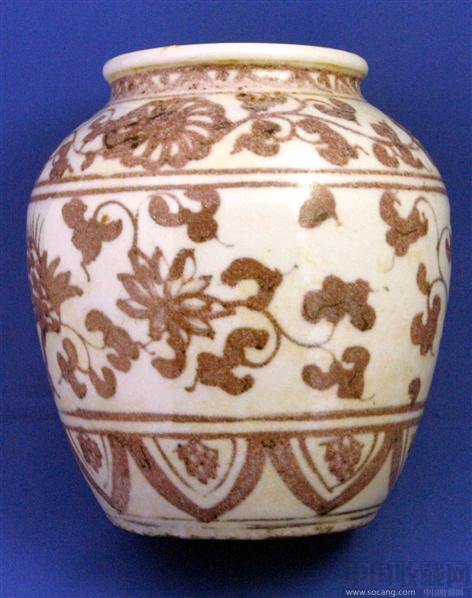 我从日本带回来的元末明初釉里红罐。有专用的保管盒子。;有几个看点:1、胎形厚实。2、收足为元代样式。3、扁菊的纹理为明初的特征;。4、发色和描绘工艺为元代釉里红特征。欢迎有不同意见的藏友们发表不同意见。QQ1413744459