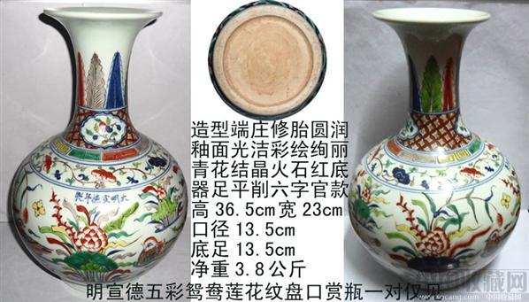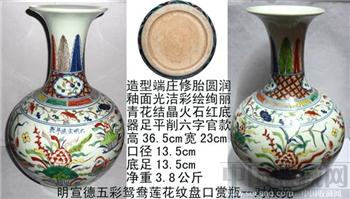 相关藏品: 明宣德[五彩]鸳鸯莲花纹盘口赏瓶一对官瓷仅见
