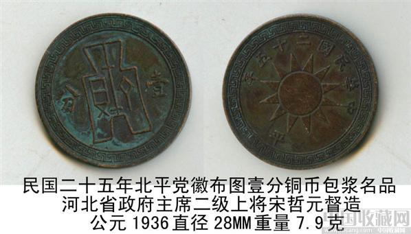 相关藏品: 民国二十五年北平党徽布图壹分铜币包浆名品