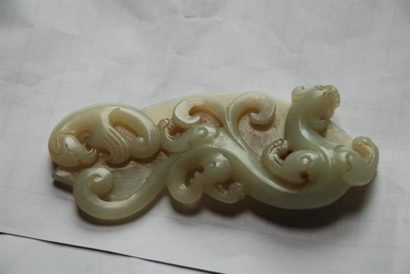 老和田青白玉螭龙玉璜,长12厘米,宽4.8厘米,厚1.7厘米,玉质好,雕工精湛,喜欢13671320723,QQ465609368
