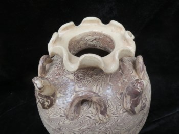 绞胎陶瓷亦称“绞泥”、“搅胎瓷”、“透花瓷”。绞胎是唐代陶瓷业中的一个新工艺,唐代以前尚未出现,所谓绞胎,是将两种或两种以上不同颜色的瓷土揉和在一起,然后相绞拉坯,制作成形,浇一层透明釉,烧制而成。由于泥坯绞揉方式不同,纹理变化亦无穷。能绞出木纹、鸟羽纹、云纹、流水纹,有的如老树缠绕盘根错节,有的如层山叠嶂起伏不定,构思奇巧,变化万千。每一件产品都有其不同的纹理特色,其纹理结构只有相似,没有相同。保存完好,包老到代。