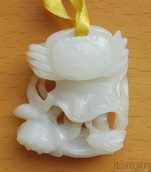清代和田白玉莲叶与螃蟹纹佩件 玉质雕工皆美