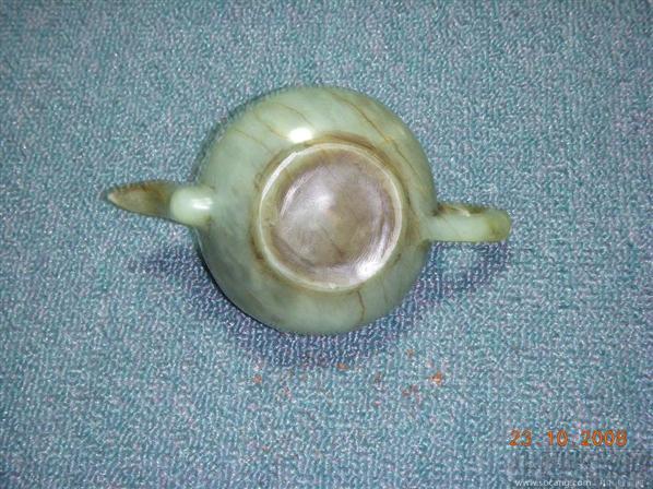 壶体温润油腻,包浆熟旧,品相完好无损。沿玉绺线有自然沁色,底足微凹,放大镜下可见手工痕迹。无款。重365克。由一块和田青白玉琢磨而成,实属不易,当属清代官宦富豪人家之用品。
