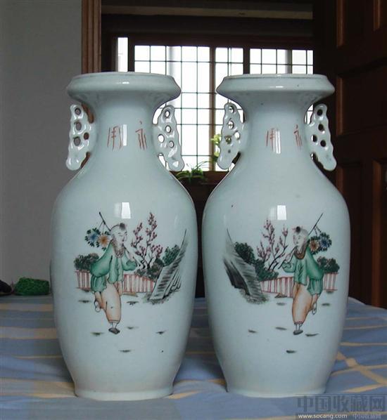 民国粉彩举案齐眉和谐家庭纹瓶(一对),画靓彩丽形可爱.瓶背面画的是一顽童在戏耍,趣味十足。摆在家里,既养眼,又有效仿古人,和谐家庭之潜移默化之功能.不可多得.(高27.8公分)联系13709224661