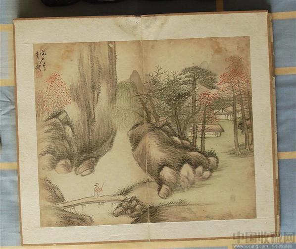 清代郑小痴先生画册;,是清代嘉庆道光时代山东著名山水画家郑谟的真迹.其名郑谟,字小痴,号士芳子.山东歴城人.亦善山水,有父风.---(济南府志).此画册共收画14幅.最后一幅画于道光元年,既1821年.画风古朴,简约恬静而意趣盎然.实为不可多得之珍品.(画册为木板册面,画面长31.5宽35.6公分)参考价40万元。联系
