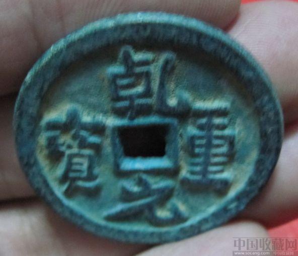 直径3.4cm“乾元重宝”简介:天宝十六年(公元757年)肃宗根据御史中丞兼铸钱史第五琦的建议“奏请改钱,以一当十,别为新钱,不废旧钱,冀实三官之资,用收十倍之利,”“宜听于诸监别铸一当十钱,文曰乾元重宝。其开元通宝者依旧行用。”在乾元元年(公元758年)发行了“乾元重宝”当十钱。版别分狭缘,阔缘,光背,背星,月,祥云,瑞雀,背十,背洪等,按照一当十的比价与“开元通宝”并行流通。乾元二年(公元759年)唐王朝又发行了“乾元重宝”当五十的大钱,该钱背面的外郭为重轮,俗称重轮乾元钱,对“开元通宝”比价为一当五十。形成了“重轮乾元”、“乾元重宝”、“开元通宝”三钱同时流通,造成市面出现混乱,通货贬值,物价上涨,由于私铸一枚重轮乾元钱,可获十倍的利益,私铸猖獗,州县不能禁。《新唐书·食货四》记载“法既屡易,物价腾贵,米斗钱至七千,饿死者满道。初有“虚钱”,京师人人私铸,并小钱,坏钟,像,犯禁者愈众。郑叔清为京兆尹,数月榜死八百人。”;(个人观点:上述史载并未提及“乾元重宝”背百钱,而本币很有可能属私铸钱,以一当五十已可获十倍之利,当百则更为丰厚,在局势混乱信息不发达时期流通,达到从中渔利的目的。该币书法别具一格,富有韵味,而且当百钱不可能大量流通,估计铸量稀少,存世更是凤毛麟角,珍稀难遇。)